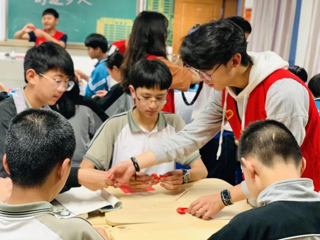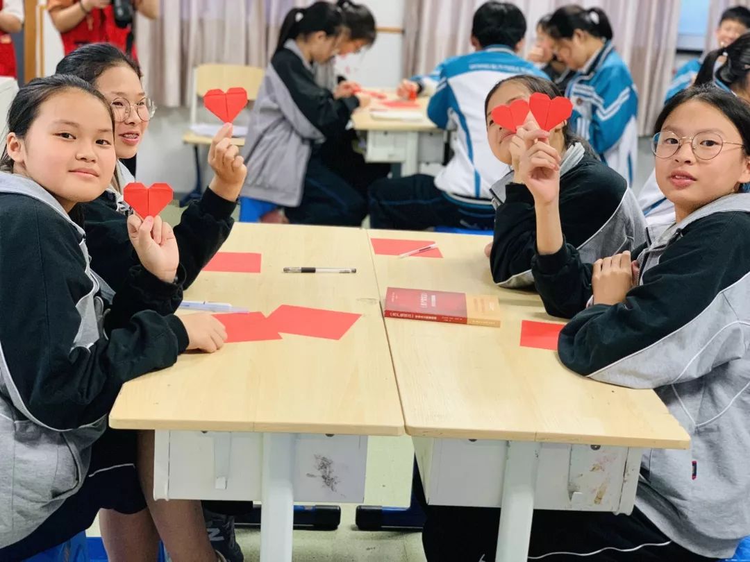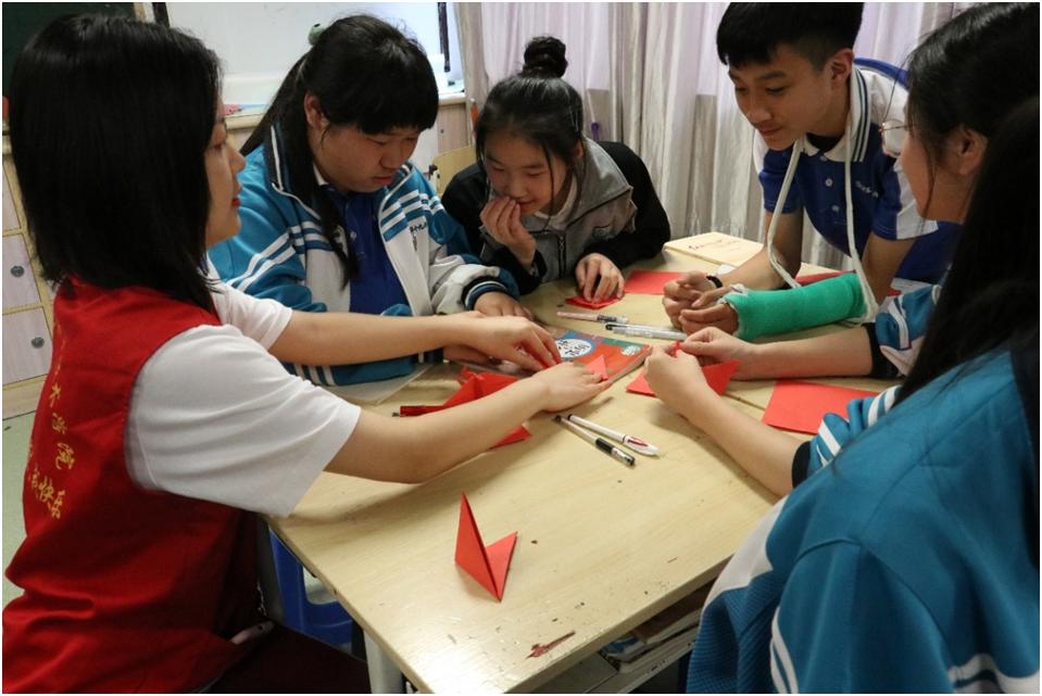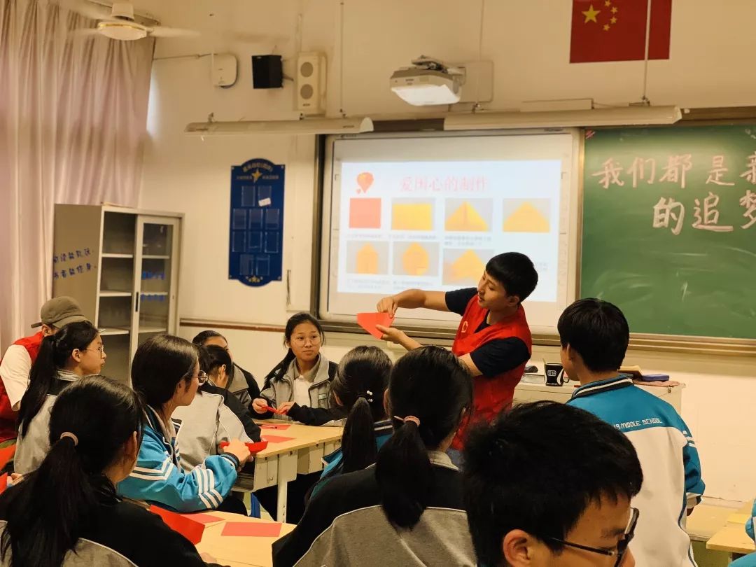 在课堂的最后,志愿者们和十九中的同学们一起制作“爱国心”。过程虽然复杂难懂,但志愿者们耐心为同学们讲解,手把手教他们如何折出漂亮的“爱国心”。一颗颗红色的“爱国心”倾注了同学们认真的用心,也是他们表达自己爱国的一种方式。