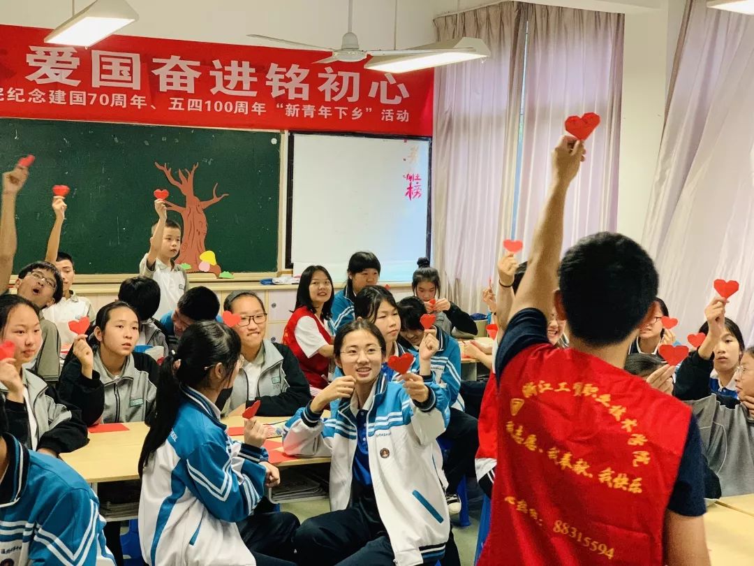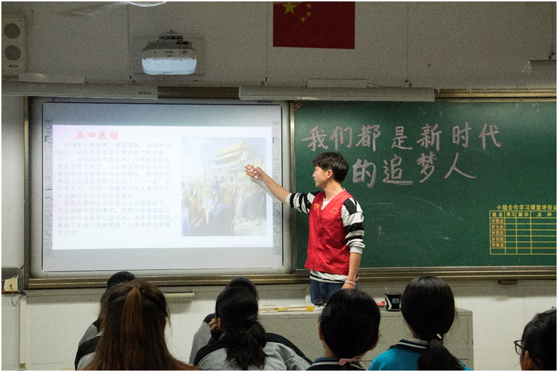 在课堂上,在播放了与“五四运动”相关的小视频之后由我们的志愿者代表为同学们讲解了“五四运动”历史过程,详细地解析五四精神内在含义,激发了同学们强烈的爱国情怀。在学生代表提出有关于青春与爱国之间的问题时,十九中的同学们都表现得非常积极,踊跃举手回答,志愿者们也为答对的同学送上了精心准备的红色书籍,。
