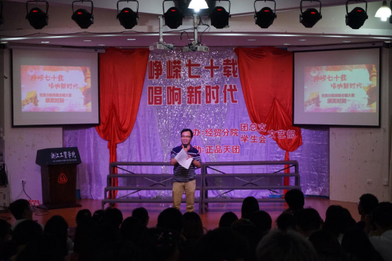 为纪念新中国成立70周年,激发经贸学子的爱国热情,经贸分院于5月30日晚在阶梯教室举办了以“峥嵘七十载,唱响新时代”为主题的大合唱比赛。经贸分院党总支书记张勰,教学秘书赵玲芳,辅导员向政、郑雪琦,国贸专业教师吴奇帆,15级文艺部部长余松阳,17级团总支学生会主席朱凯作为评委应邀出席。此外,300余名经贸学子到场观看比赛。