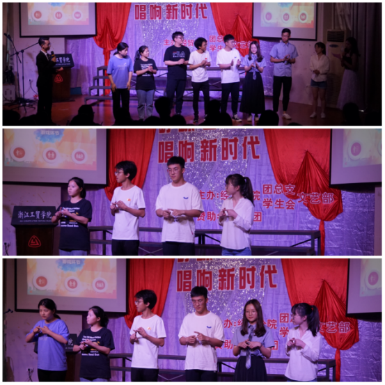国贸1703班的歌曲串烧,浅吟低唱的悠扬曲调与高亢红歌形成的反差瞬间抓住了观众的眼球。3+2营销1801班的《走向复兴》铿锵有力,唱出了新时代爱国青年的赤子之心,仿佛带我们身临那段峥嵘的历史岁月;商英1803的《大中国》激昂豪迈,用雄壮的旋律诉说着青年对祖国的热爱,嘹亮的歌声响彻阶梯教室内外。