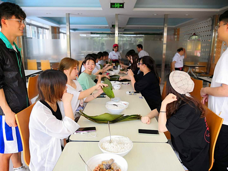 端午节又称端阳节、重午节、龙舟节、龙日节、正阳节、浴兰节、天中节等等,是中国民间传统节日,志愿者们午饭过后就到达学院三号餐厅做好准备工作,学院其他学生到齐后志愿者们开始教学生包粽子,每个学生都兴致勃勃的开始自己包粽子。此次活动为了让学生从动手包粽子的过程中体会中国独特节日的魅力,弘扬中国传统,体会中国传统文明的魅力。也让学生了解端午节历史由来——屈原。为了纪念屈原,学习屈原爱国爱民坚持真理,宁死不屈的精神和屈原高尚的品质。学生认真包着各种形状的粽子,现场其乐融融,欢声一片。