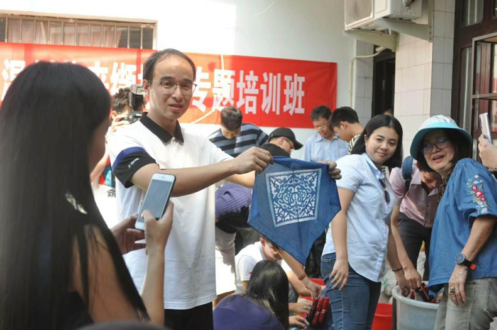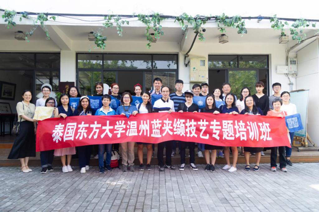 6月5日,泰国东方大学孔子学院二十余位师生走进温州瓯窑小镇我院工业设计工作坊,参加我院组织的温州蓝夹缬技艺专题培训。