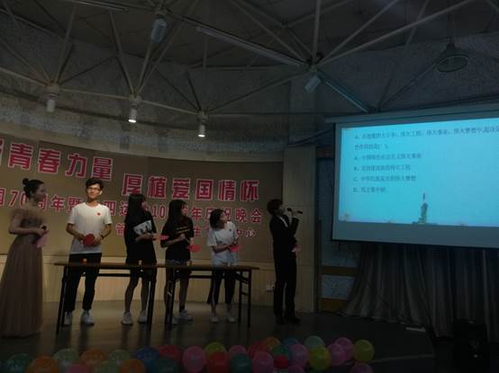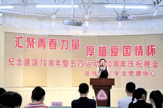 2019年6月5日晚,由管理分院学生党建中心举办的以“汇聚青春力量,厚植爱国情怀”为主题的庆祝中华人民共和国成立70周年暨五四运动100周年庆祝晚会在学院多功能厅举行。管理分院党总支书记项光春老师、管理分院第二学生党支部书记朱观娟老师、管理分院辅导员季焕磊老师出席,管理分院2017级学生预备党员、发展对象及2018级团支书和学生入党积极分子代表近150人参加活动。