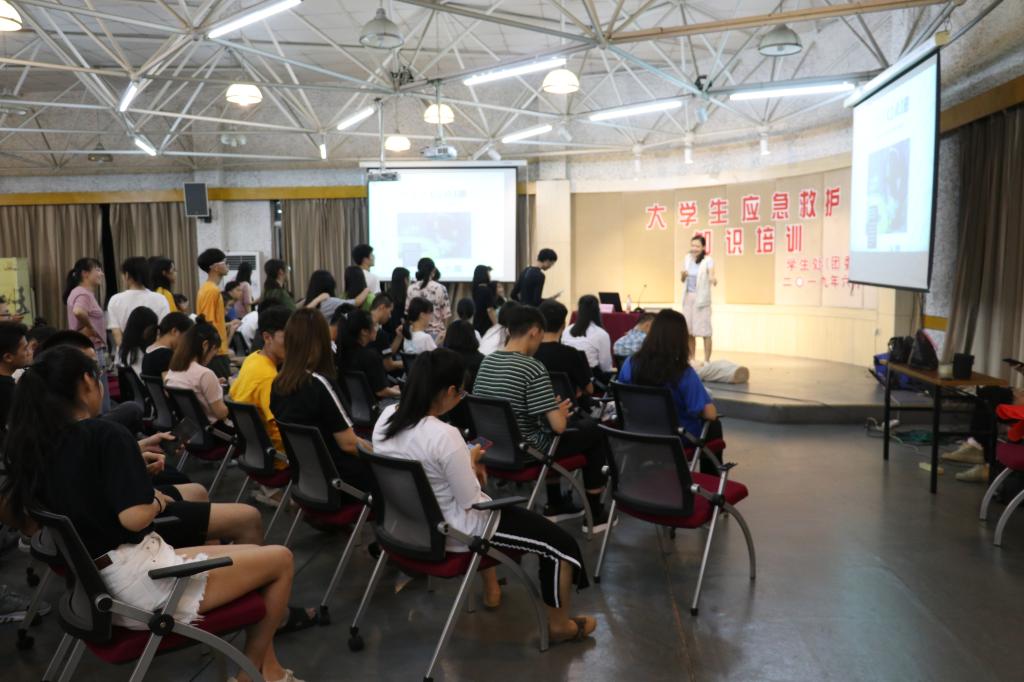 本次知识培训的主讲人朱铮铮老师是红十字讲师,从事急诊工作十余年,附二医急诊科主管护师。她通过创伤概论、心肺复苏、AED的使用等方面为队员们进行面对面的授课,同时针对同学们在暑期社会实践当中易出现的中暑问题进行了急救知识的培训,以提高同学们的应急救护能力。朱铮铮老师还通过模拟仿真人,向同学们演示如何进行胸外按压应对紧急情况。培训中,朱老师也让两位同学上台进行真人演示,让同学们提前进行学习和演练。