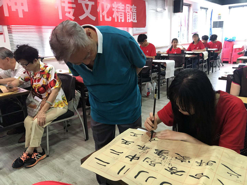 上午的活动由社区一支有名的书法老人队伍来教志愿者练习书法,书法班的老人的字是成年累月的象征,一笔笔铿锵有力。老人与志愿者们听着讲台上书法班创始人传授书法知识的同时也兴致勃勃的拿起了毛笔在宣纸上一笔一划,轻重有度的写着行云流水的字体。书法活动结束后,志愿者受到了笔酣墨饱的书法老人的夸奖,现场其乐融融。
