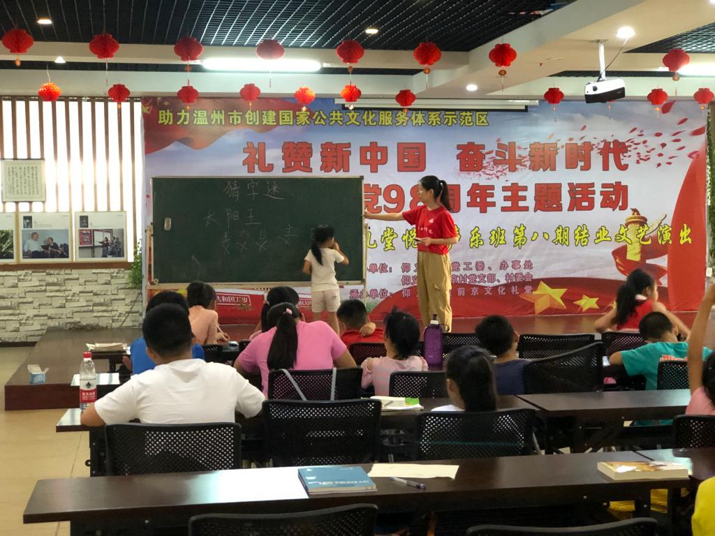 2019年7月2日,“爱无止尽 星火传承”新青年下乡走进鹿城区前京村文化礼堂,为小朋友进行了以“爱无止尽,星火传承”为主题的支教活动。