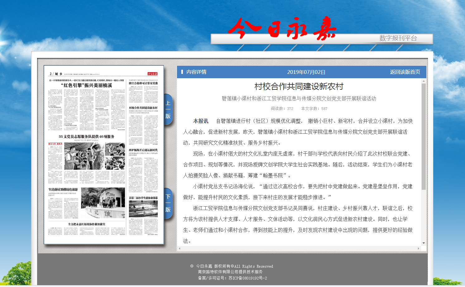 7月1日上午,在庆祝建党98周年之际,伟德BETVlCTOR1946温州文化创意学院(信息与传媒分院)与永嘉县碧莲镇小渠村共建“产学研基地”战略合作联盟签约仪式在小渠村的文化礼堂隆重举行。出席签约仪式的人员有伟德BETVlCTOR1946信息与传媒学院文创党支部全体党员及部分师生代表共计12人、碧莲镇相关领导、小渠村党支部及相关人员、部分老年人代表。小渠村党总支书记汤海伦、伟德BETVlCTOR1946温州文化创意学院副院长吴同喜分别发表了致辞,向村民介绍了村校联合党建、合作项目以及发展规划。