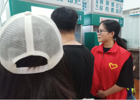 其中10名志愿者经过心肺复苏的救护及轮椅、医用推床、预约自助机器的使用培训后,正式开始“上岗”,他们每天从早上8点到下午4点,分布在医院各个楼层的自助机前,为1000名以上的病患亲属做指引,帮助他们预约病人想要名医门诊。他们在走廊门前为那些不熟知门诊科室的工作人员、患者及其家属做指引工作。6小时的站立支撑着志愿者的是爱心与满满的真情。