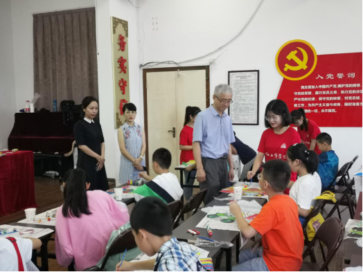 2019年7月9日下午,浙工贸贺星岳院长冒雨来到鹿城区蒲鞋市街道锦园文化礼堂,看望慰问管理分院“青春非遗,活态传承”新青年下乡服务队在社区开展“非遗传承”的志愿者们。慰问期间,贺院长仔细了解志愿者们活动开展计划安排、活动开展情况,对同学们的“非遗”传承举动点赞,并鼓励大家继续加油,让更多的小朋友们体验非遗文化的魅力。