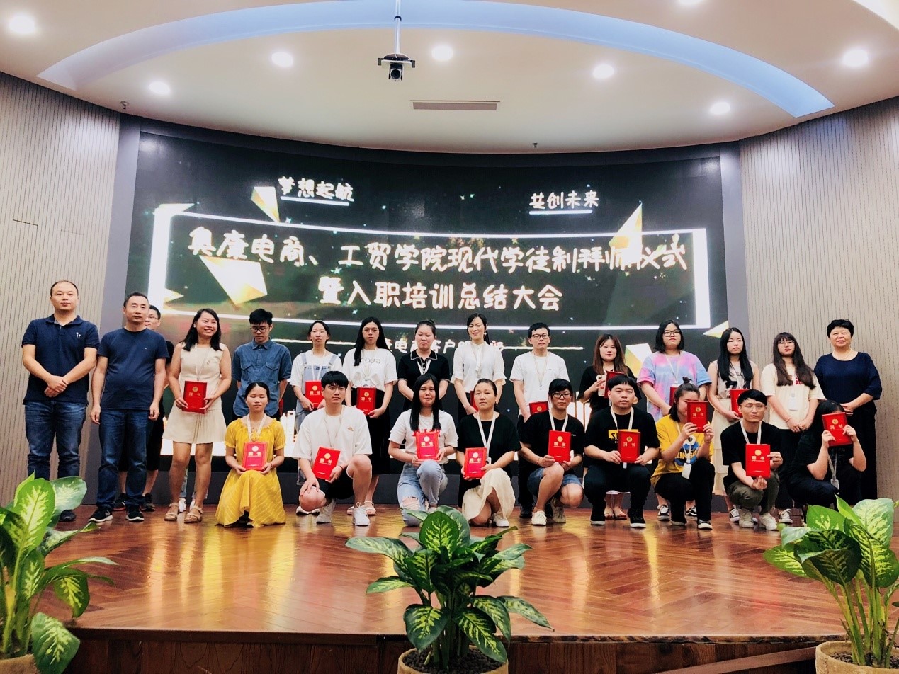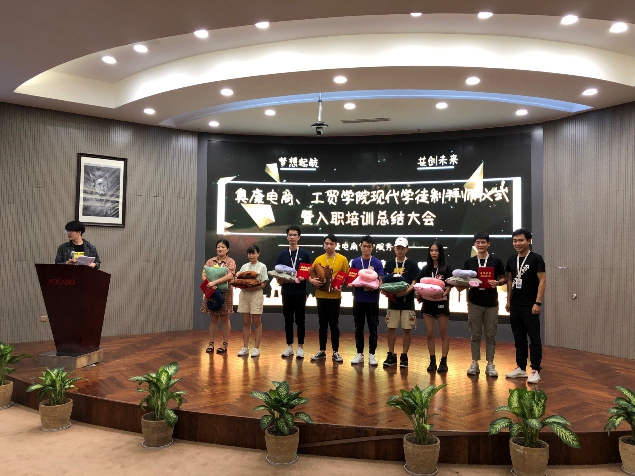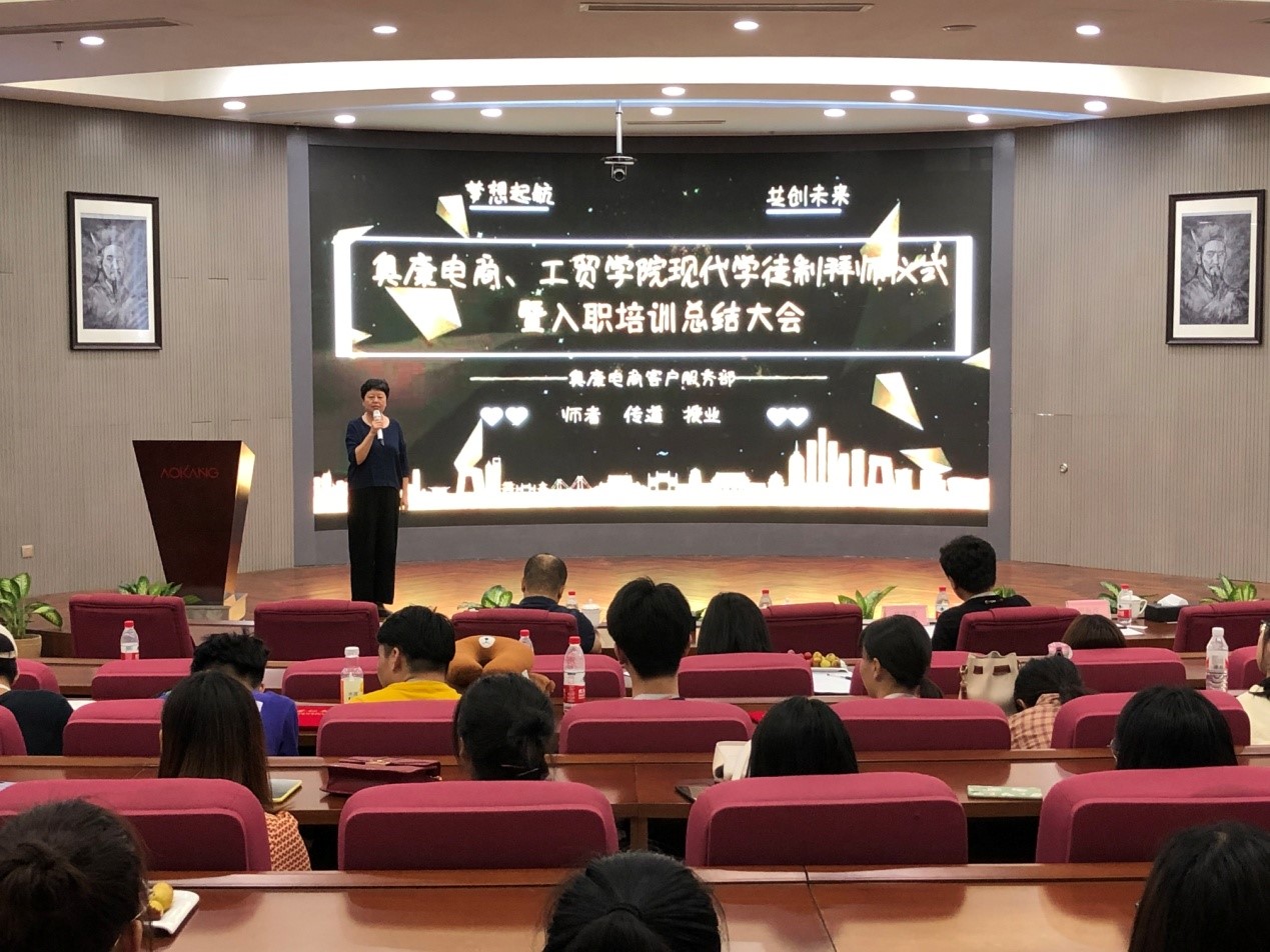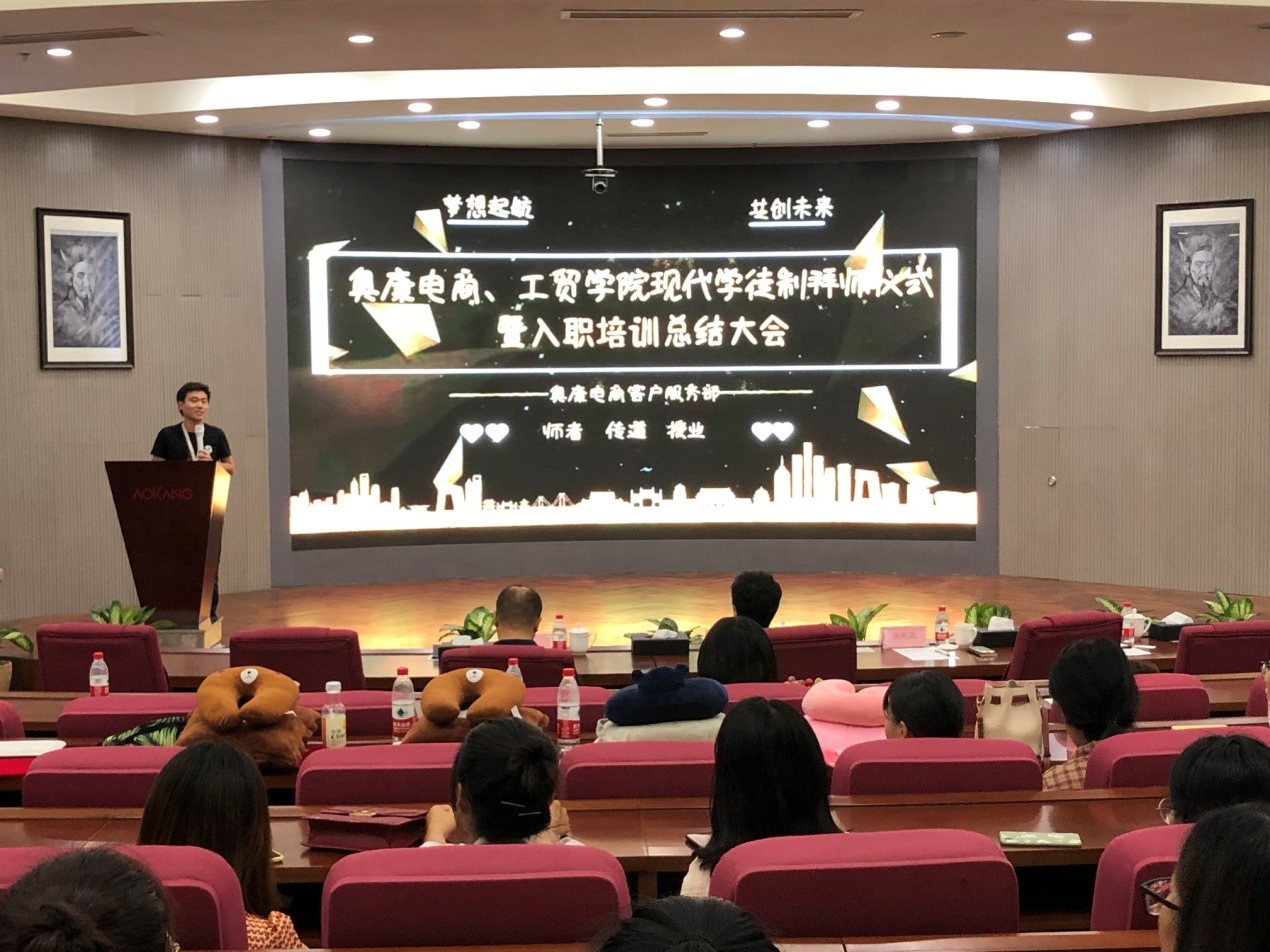 9月7日下午,金秋送爽、丹桂飘香,奥康集团文化展示厅内的良知大礼堂洋溢着热烈的氛围和青春的气息,我院经贸分院电子商务专业与奥康集团合作的学徒制班拜师仪式在这里隆重举行。奥康商城本部总经理陈祥武、浙江工贸职业学院经济与贸易学院院长成荣芬、奥康国际电商人事部经理潘婷婷、奥康国际电商客服部经理林晶晶、经贸分院实训中心主任张禹,以及奥康商城的员工师傅们、经贸分院电子商务专业部分教师、“奥康”学徒制班的全体同学共80多人参加了本次拜师仪式。