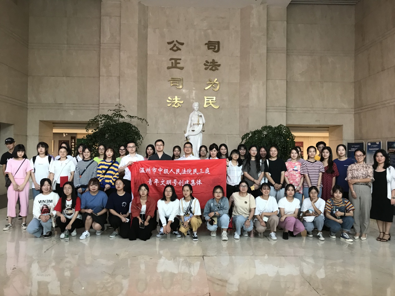 为巩固学生所学理论知识,强化实践能力,提升职业素养,探索创新实践教学模式,2019年9月25日下午,温州知识产权学院2019级新生在专业教师带领下前往温州市中级人民法院开展实践教学活动,温州市中级人民法院民事审判第三庭庭长陈锋等多名法官接见了到访师生们。首先,讲解员带领到访师生们参观了法院的阳光大厅和历史长廊,了解温州中院的发展历史以及智慧法院和家事审判等多项特色活动和成就,直观体会法院的工作环境。