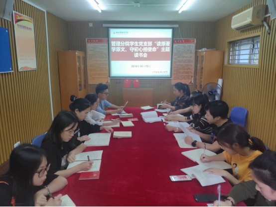 为深入学习贯彻习近平新时代中国特色社会主义思想,按照管理分院党总支“不忘初心、牢记使命”主题教育工作推进计划,管理分院旅游酒店专业党支部、会计金融专业党支部、人力资源管理专业党支部、学生党支部等四个党支部于2019年10月15日至16日分别召开了“读原著学原文、守初心担使命”主题读书会。管理分院各党支部全体党员参加了会议,会议由各党支部书记主持。