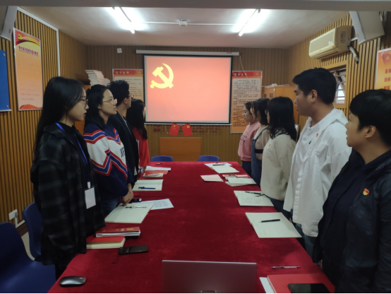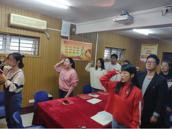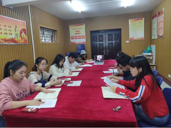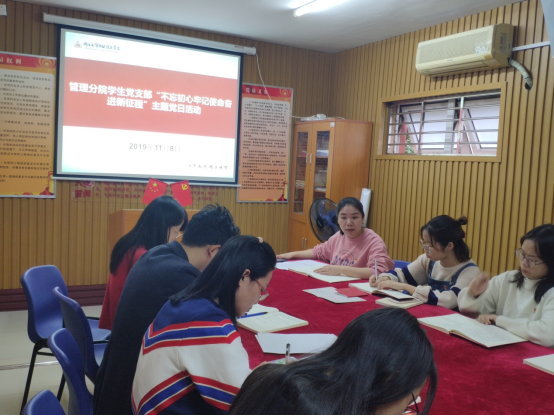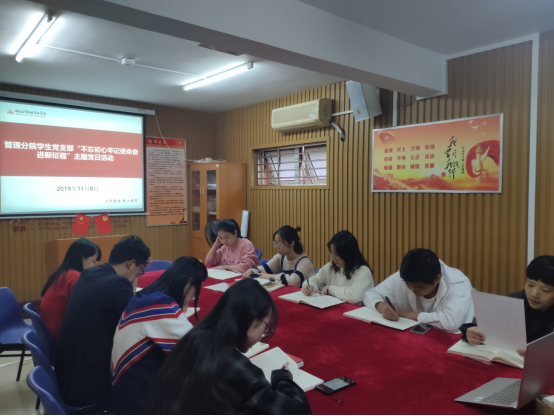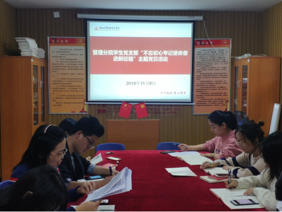 2019年11月8日下午15:30,管理分院学生党支部在党员之家组织开展“不忘初心牢记使命奋进新征程”主题党日活动暨主题教育支部书记讲党课。会议由陈君老师主持,陈赛群老师、贾飞祥老师、季焕磊老师、朱观娟老师以及学生学生党员,校外实习学生党员视频会议形式参加。