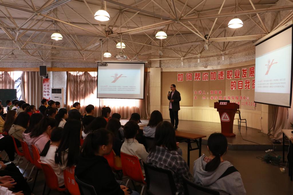 为更好的帮助我院毕业生了解自身的职业发展,明确职业方向,挖掘隐藏潜力,11月21日下午,学院就业指导服务中心邀请高富春老师在多功能厅为我院毕业生带来关于“帮你加速职业发展的自我探索”为主题的讲座。讲座面向全校师生开放,吸引了近200位同学到场,现场气氛活跃。