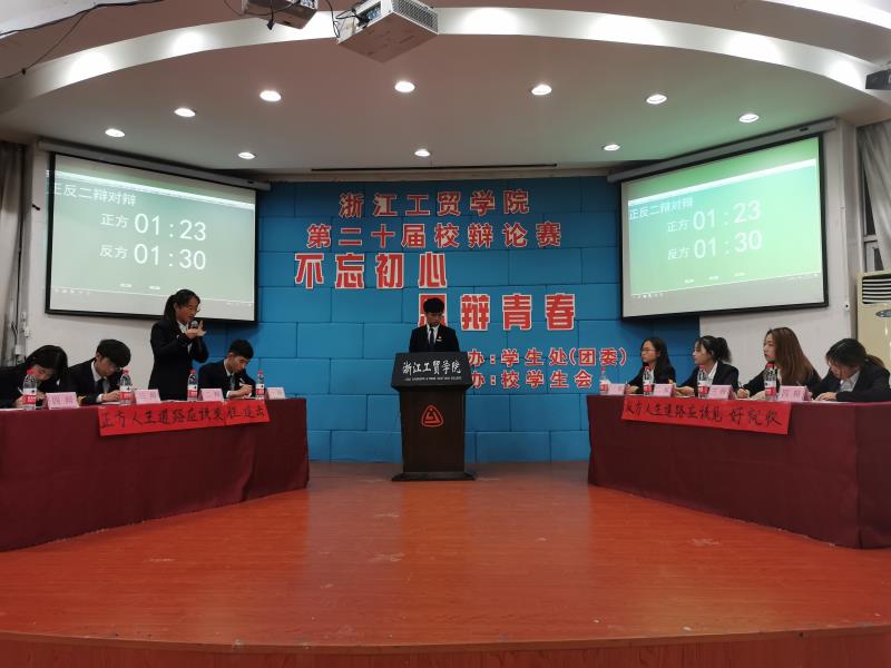 为了推进校园文化建设,营造善于思辨的学习氛围,促进思想碰撞和观点交流,锻炼同学们思维表达能力和团队精神。由学生处(团委)举办,校学生会承办的浙工贸第二十届“不忘初心,思辩青春”校辩论赛在阶梯教室举行。