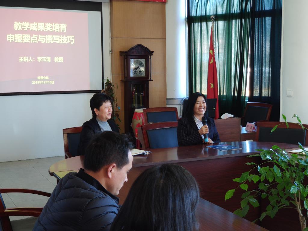 李玉清教授是全国农业职业教育教学名师、中国电子商务协会高级专家,在职业教育教学研究与实践方面有着丰富的经验和成果,曾获得各级教学成果一、二等奖多项。在报告中,李教授以“专业群建设”、“三教改革”、“1+X”证书试点等当前职业教育改革发展热点为切入点,详细阐述了教学成果的培育、选题、材料组织、文本提炼等内容,并以其主笔的获奖教学成果申报材料为范例做了生动的案例剖析。同时,李教授还勉励分院青年教师立足课堂,致力于课堂教学改革,在教学一线的探索实践和改革创新中总结提炼、不断积累,培育职业教育教学成果。