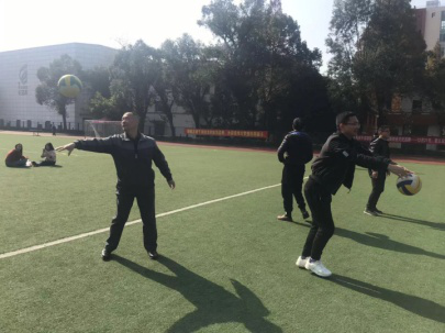 项目四:集体参玩项目,不限人数在操场跑道上竞走,在操场的草坪上进行花样垫球,目的让参与教师沐浴着冬日的阳光,微微出汗,放松自己。