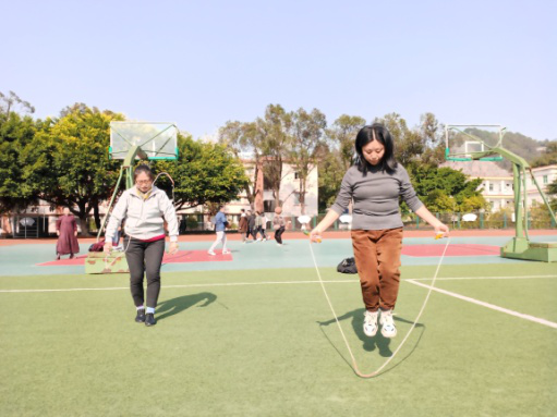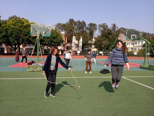 随着蒋老师的“开始”一声令下,参赛选手紧张地甩动绳子,有的老师没跳几个,绳子就勾住了他们的鞋;有的老师显得非常有经验且很专业,手中的绳子越转越快……经过角逐,夏梅娣老师以一分钟162下,赢得了第一名。