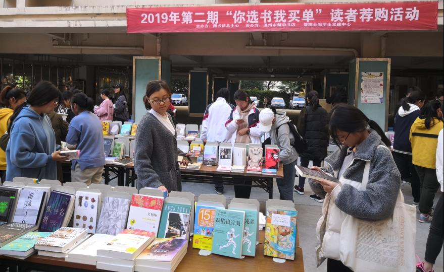 12月13日下午,由学院图书信息中心主办,温州市新华书店和管理分院学生党建中心协办的2019年第二期“你选书、我买单”读者荐购活动在学子广场举行。本次活动共展出了400余种时下各个阅读榜单上评选出的最受读者喜爱的热门读物及部分经典名家名作。