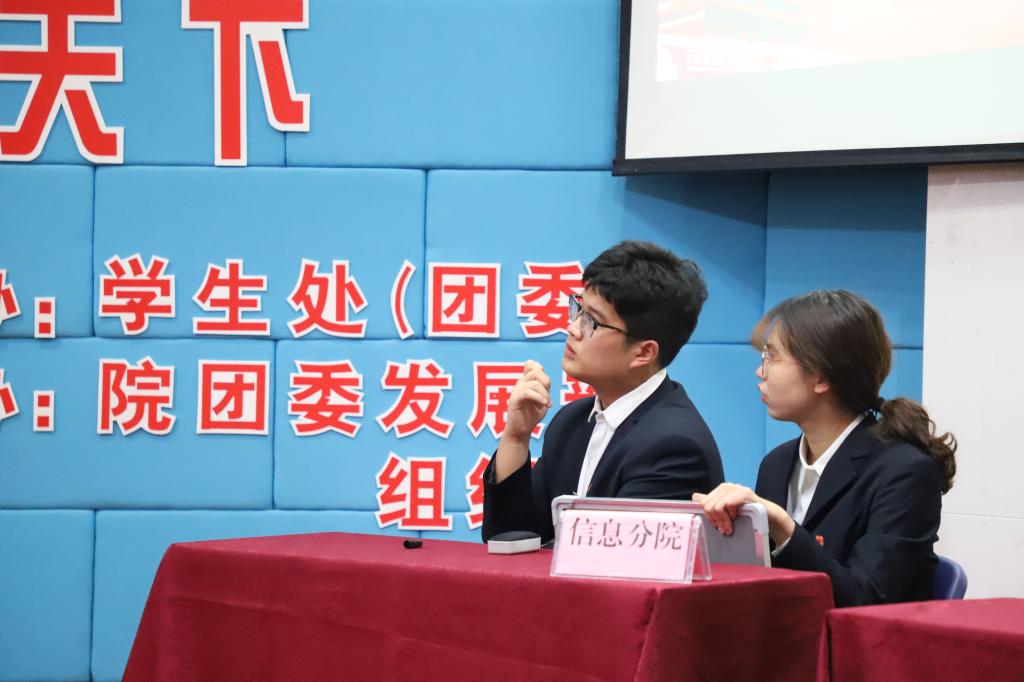 为了更好地铭记党的历史,传承党的光荣传统,继承和发扬党的优良作风以及高尚情操,大力弘扬以爱国主义为核心的民族精神和以改革开放为核心的时代精神,加强大学生思想教育及对时事热点知识的学习。由学生处(团委)主办,院团委发展部、组织部承办的“学党史、悟党性、晓时政、知天下”党团时事知识竞赛,于12月15日晚6:30在阶梯教室隆重举行,此次活动由经贸分院党总支书记张勰老师、党院办李红伟老师,思政教研室郑严老师担任评委。来自各分院(系)的共计十一支代表队参赛。