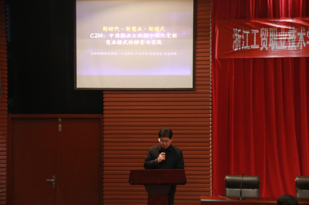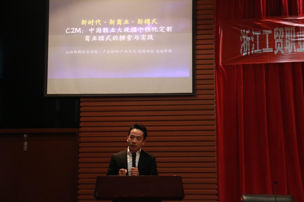 紧接着,由潘少宝先生进行主题演讲。他提出,未来的时代,趋势大于优势,能走多远取决于与谁同行。他为学生们分析了2020—2030年中国经济走向,并强调了新时代下个性化定制的发展,以案例的形式向学生们分享,引导学生如何思考,并与现场学生探讨鞋类专业的发展趋势、企业就业发展形式和职业生涯规划。