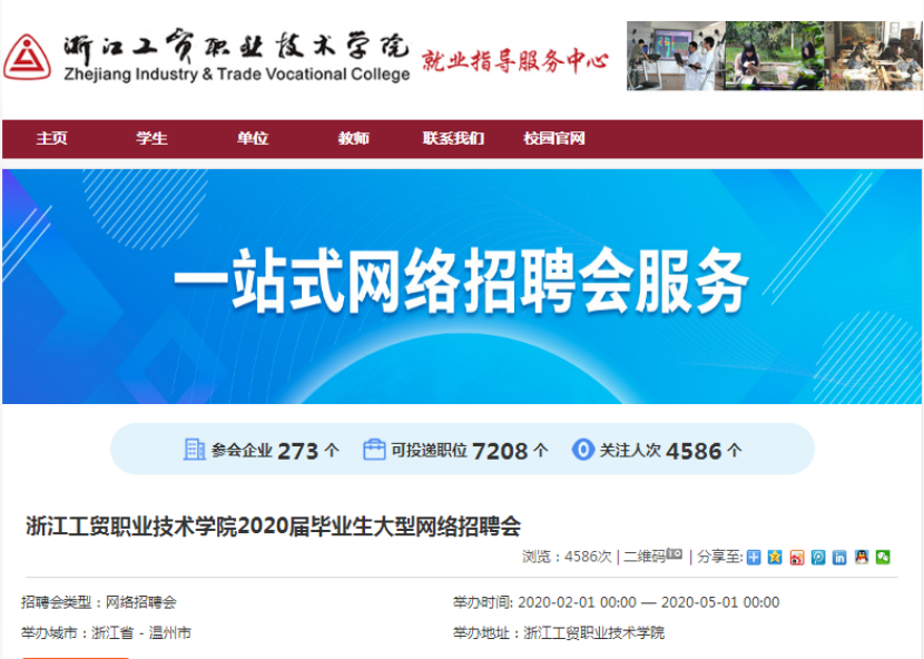 疫情解除之前,学院将暂停举办用人单位宣讲、招聘会等各类线下校园招聘活动。线上启动一站式网络招聘会,远程视频面试功能将于本月底上线。学院将与用人单位保持密切联系,为大家提供丰富的招聘信息,并积极组织用人单位开展线上招聘活动。同时,学院就业指导中心将及时汇总各类用人单位招聘信息,并通过“浙江工贸学院招生就业服务”微信公众号、学院就业指导服务中心网(http://zjitc.jysd.com/)进行发布,不断为毕业生提供就业岗位,请毕业生关注查看相关招聘信息。
