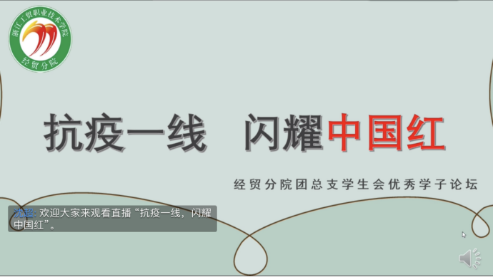 为了提高学子们对疫情的防范意识,了解更多的优秀榜样,2月22日晚上18:00,经贸分院通过钉钉在线直播的方式举办了以“抗疫一线,闪耀‘中国红’”为主题的优秀学子论坛活动。营销1702班退伍军人章东方,营销1701班班长郭小祥,国贸1701班班长黄人贵,商英1701班班长余雅倩作为优秀学子代表分享自己的经历。当晚在线观看数达204人,全程直播累计弹幕数达236条、点赞数达7257次!