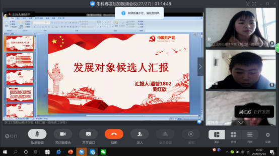 2020年3月14日,管理分院学生党支部在钉钉平台上进行建党对象候选人线上汇报竞选活动。本次活动邀请到管理分院党总支书记项光春老师,管理分院学生党支部书记陈君老师,管理分院辅导员贾飞祥老师、朱观娟老师、陈赛群老师、季焕磊老师、管理分院30名学生党员以及24名发展对象候选人参与活动。