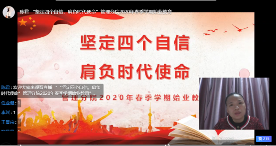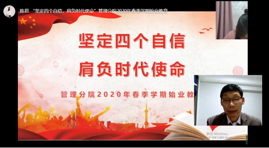 管理分院院长潘毅老师结合自己的感受,以“自豪、感恩、自强、和善”这八个词总结出这次疫情背景下的工作学习感悟,不仅给同学们带来了启发,更多的是带给同学们一种使命感,争做一名新时代有能力,有自信,有担当的优秀青年。