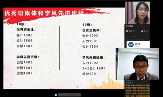 大会由辅导员先后宣读了管理分院2019年秋季学期优秀班级和学风先进班级名单、2019年秋季学期《学习强国》学习优秀班级和优秀个人名单、疫情防控学生志愿者标兵和优秀志愿者名单以及管理分院体能空中擂台赛获胜名单等。