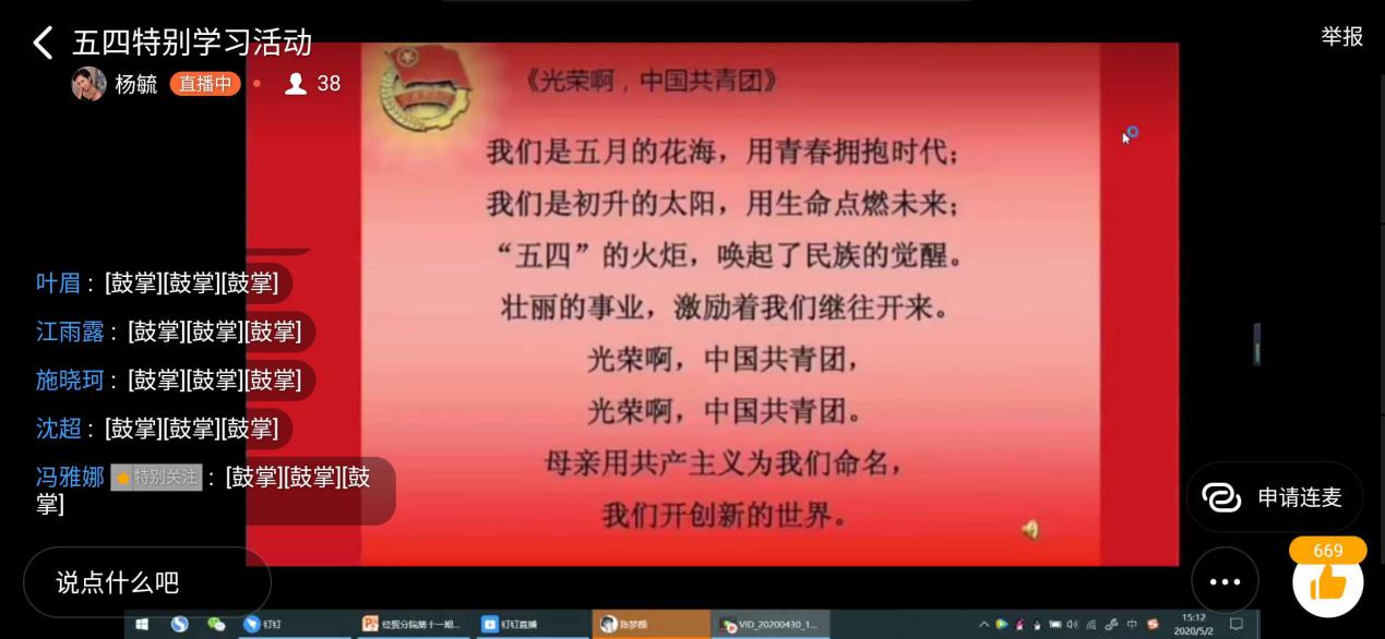 接下来,商英1901班魏静、商英1901班胡海佳、国贸1904方瑜婷三名学习会会员以短视频的形式朗读了纪念五四运动诗歌——《辉煌的五月》。主持人提到,习近平总书记给北京大学援鄂医疗队全体90后党员回信中写道:“在新冠肺炎疫情防控斗争中,青年人同在一线英勇奋战的广大疫情防控人员一道,不畏艰险、冲锋在前、舍生忘死,彰显了青春的蓬勃力量,交出了合格答卷。广大青年用行动证明,新时代的中国青年是好样的,是堪当大任的!”当代青年用自己的实际行动完美地诠释了“五四精神”。