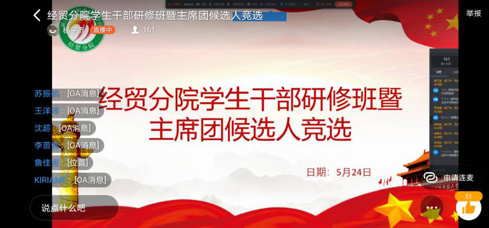 12位同学依次演讲结束后,张勰书记做了精彩的总结发言。首先,张书记对候选人的自身素质、准备情况与演讲内容进行了充分肯定;其次,书记指出现阶段还处于疫情防控的关键时期,希望大家对线上的选举模式产生思想上的高度认同;最后书记勉励所有竞选者,坚定个人理想,抓住机会,不断挑战自己。
