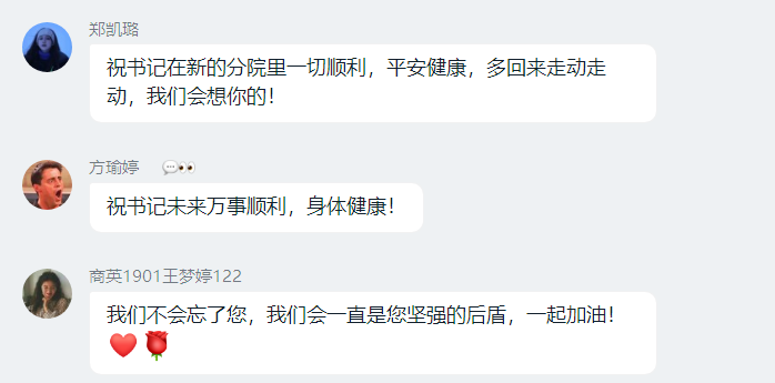 由于工作原因,张勰书记被调到其他分院。同学们内心有各种不舍,除线上播放了专门为书记制作的祝福视频外,讲座期间学生干部们还纷纷留言表达对书记的感激之情和最真诚的祝福。