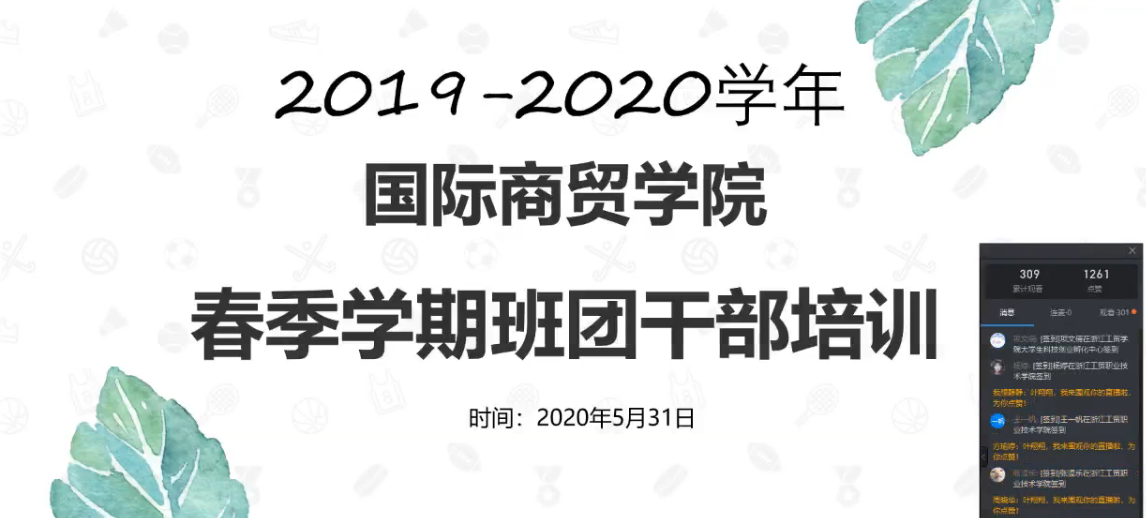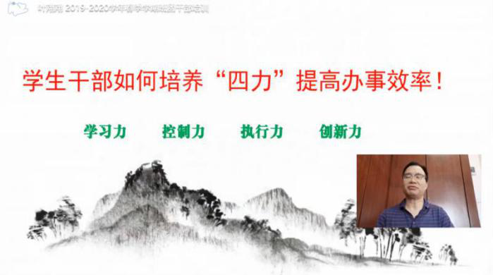 学生干部,作为班级和学生组织的领跑者,应以不间断、高质量的培训来保持队伍的先进性。5月31日上午8:30,国际商贸学院2019-2020学年春季学期首次班团干部培训通过钉钉直播的形式圆满举办,包括新加入的应用法语专业的学生干部共计350余人参与培训。此次培训由光电制造学院党总支书记张勰老师、学生处团委张慧老师主讲。