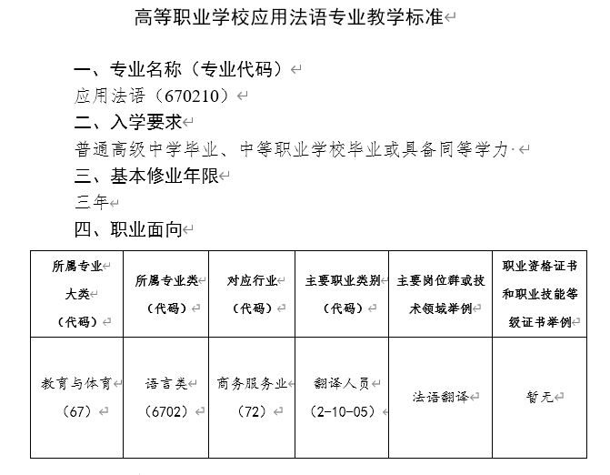 教育部职业院校外语类专业教学指导委员会于2018年底正式启动高职应用小语种专业教学标准的修(制)订工作,我院受外语类教指委的委托,作为《标准》主笔单位承担应用法语专业教学标准的研制任务。本《标准》的研制工作历时一年半,通过对行业企业、高职院校、毕业生、研究评价机构等进行调研,形成两万多字的《调研报告》,并在此基础上编写《标准》和《标准研制说明》等文件。期间,教育部行指委工作办公室和高职外语类教指委多次举行研讨会和评审会,对《标准》中的“职业面向”、“培养目标”、“培养规格”、“课程设置”等核心内容进行了充分的研讨和指导。