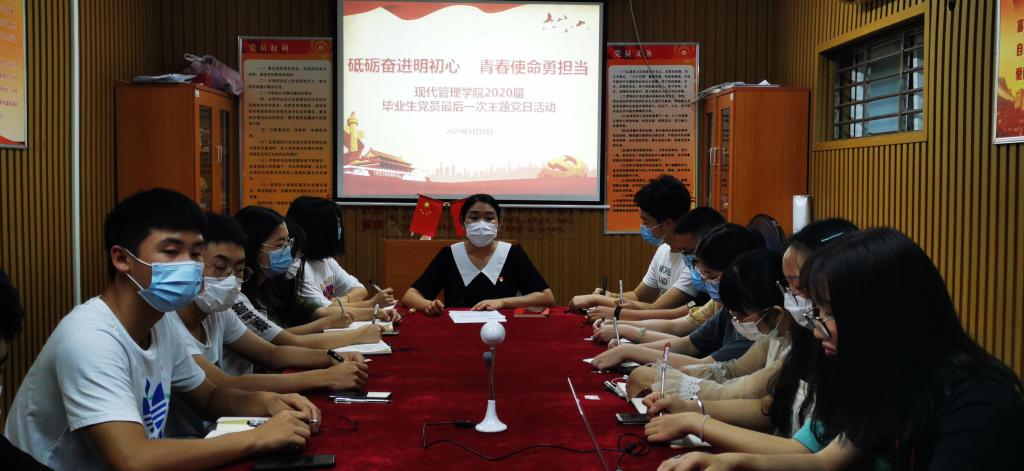 2020年6月18日晚,以“砥砺奋进明初心,青春使命勇担当”为主题的现代管理学院2020届毕业生党员主题党日活动在党员之家举行。活动采取线上+线下相结合的形式进行,现代管理学院副院长朱秀清老师、各辅导员、现代管理学院2020届毕业生党员以及2018级新发展预备党员一同参加了此次“特殊”党课,活动由陈君老师主持。