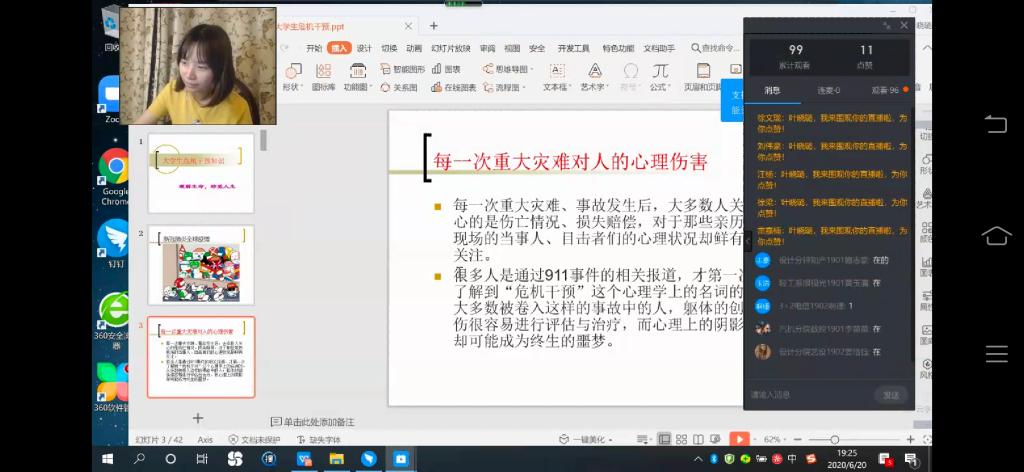 本次心理委员培训由钉钉直播在线集中学习和平台自主学习相结合。钉钉直播在线集中学习由心理老师在线授课,本次集中学习共分三个主题,分别是《大学生常见心理问题及其应对》、《大学生心理危机预防与干预》。平台自主学习通过“高校心理委员工作平台”进行,该公众号提供视频学习材料,由《心理委员的工作职责与角色定位》、《影响大学生心理健康的一些重要事件》《心理委员的会谈技巧》等十四个专题构成,每个专题学习完成之后都有相应的测试,每次测试达到85分以上才能通过学习,拿到上岗证书。