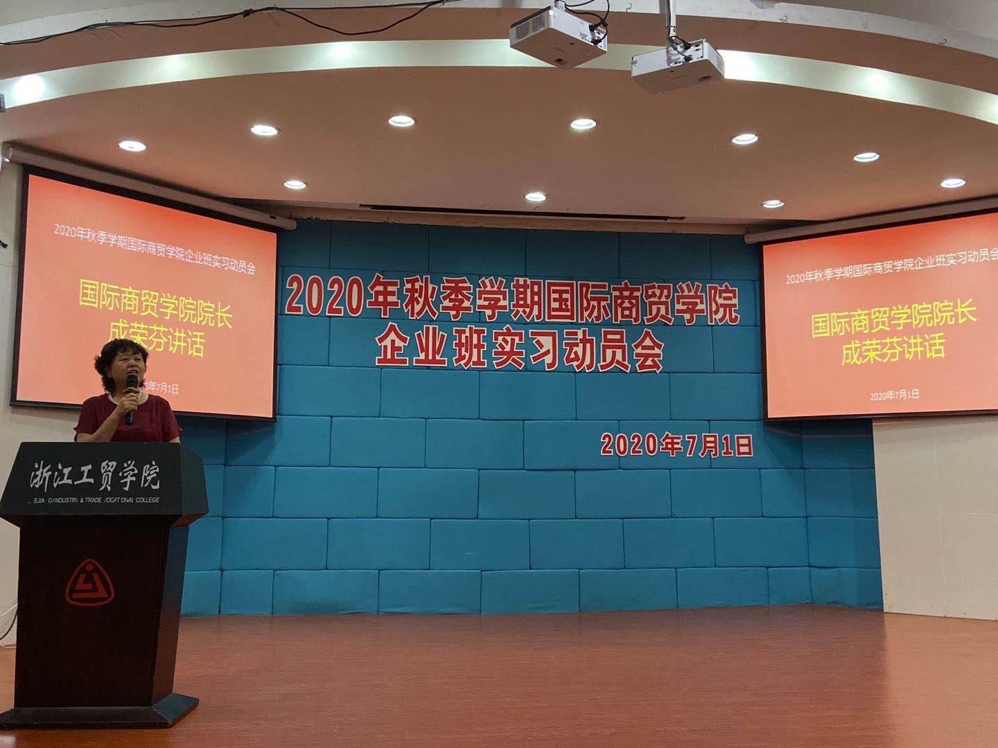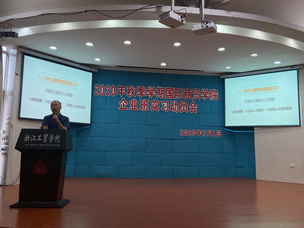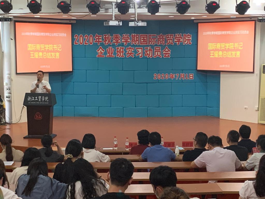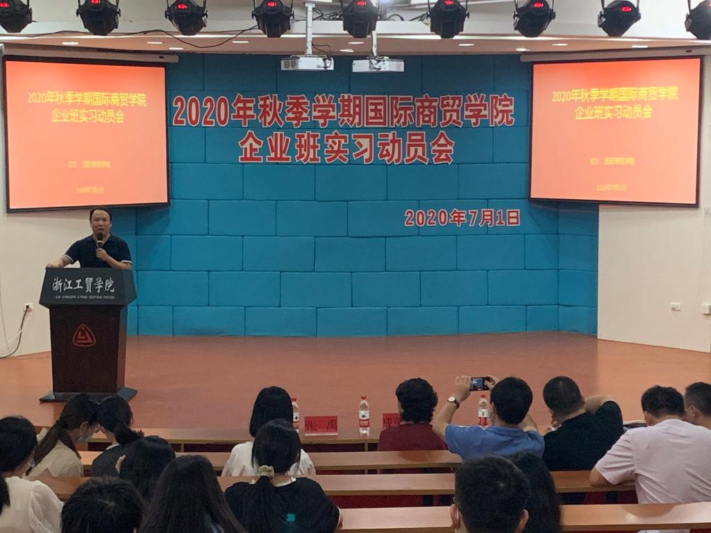7月1日,国际商贸学院在1号楼阶梯教室召开了2020年秋季学期企业班实习动员会。国际商贸学院院长成荣芬、书记王耀贵、副院长陈碎雷、专业主任徐国盛、魏振峰、王言炉、刘颖君、陈再波、实训中心主任张禹、各位实习指导教师以及将要去企业实习的学生们参加了此次动员会,会议由陈碎雷副院长主持。