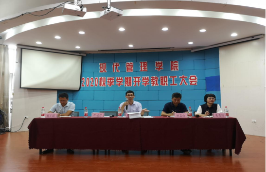 2020年9月8日上午9点,现代管理学院在一号教学楼阶梯教室召开2020年秋季学期开学教职工大会暨全体班主任会议,传达学校秋季学期工作部署精神,部署现代管理学院秋季学期主要工作,现代管理学院全体教职工和全体班主任参加,会议由现代管理学院党总支书记项光春老师主持。