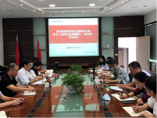 9月23日下午,现代管理学院党总支在行政楼一号会议室举行理论学习中心组(扩大)学习会,专题学习《习近平谈治国理政》(第三卷),现代管理学院党政领导班子成员、各党支部书记、各专业主任等参加了学习会。会议由现代管理学院党总支书记项光春主持。