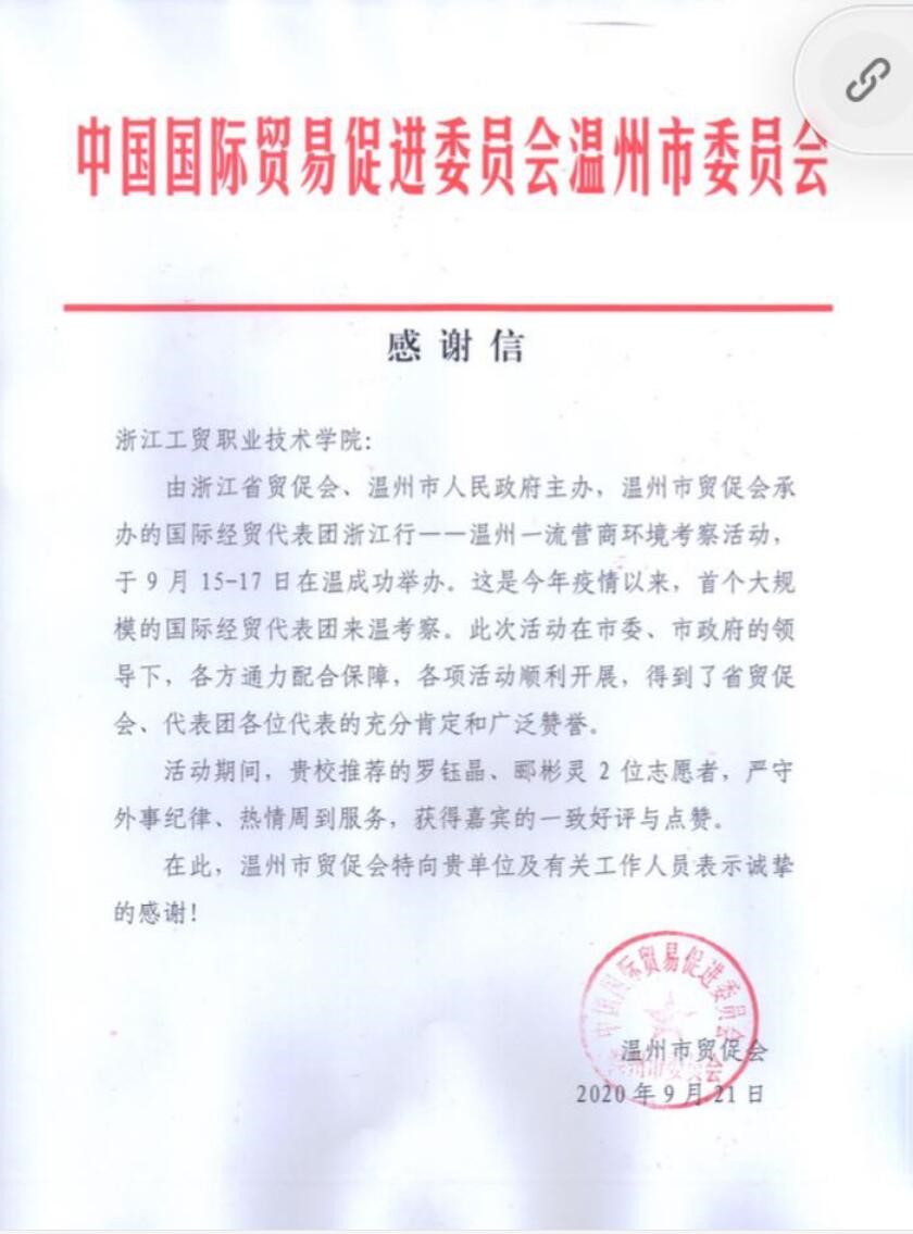 活动期间,我校国际商贸学院国际经济与贸易专业1801班的两位学生,罗钰晶、郦彬灵,全程参与这次贸促会的志愿者活动,严守外事纪律、热情周到服务,获得温州贸促会的实名表扬。两名志愿者学生全程参与活动,包括:前期人员名单核对、资料整理、志愿者(翻译)、动车站接站、外事接待、以及会议准备。学生在做志愿者活动的过程中,每一次对外宾真诚的问候、每一次热心的帮忙都换来了他们发自内心的感谢,展现了我校学生良好的风貌。国贸专业这几年一直积极选派优秀学生参与温州贸促会、温州进出口展等志愿者活动,和企业、行业共同培养真正全面发展的复合型贸易人才。