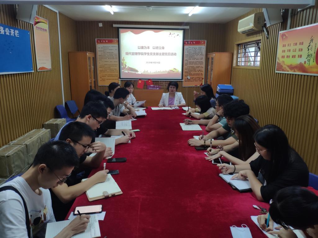 为了贯彻落实“学院2020年校园廉洁文化建设月”文件精神,学习廉洁知识,提升党性修养,2020年9月30日下午三点,现代管理学院学生党支部在党员之家开展“以廉为本·以德立身”廉洁主题党日活动,支部教师党员和学生党员参与学习,活动由学生党支部负责人黄丹华主持。