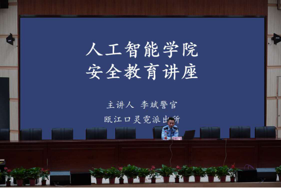 2020年10月21日晚,人工智能学院在咨询楼报告厅举行“平安校园 你我共建”为主题的新生安全教育。瓯江口分局灵霓派出所李斌警官为主讲嘉宾,2020级全体新生、辅导员及班主任参与会议,会议由徐登喜书记主持。