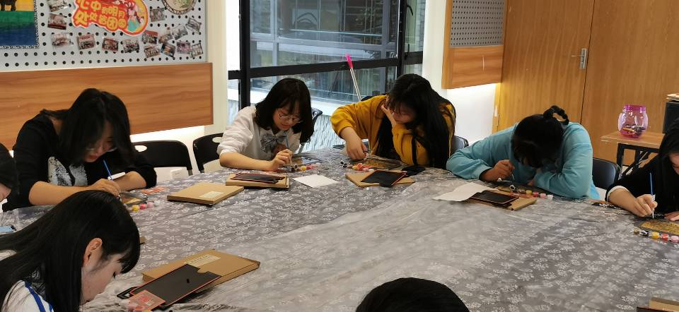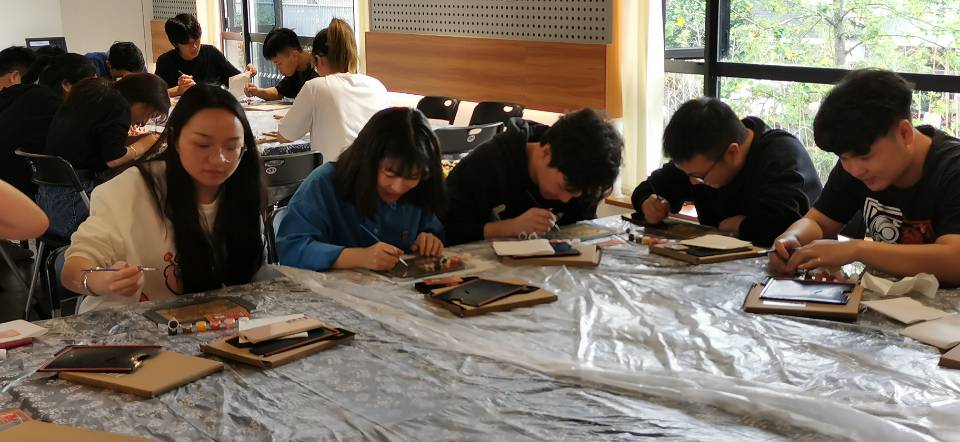 之后,指导老师讲述了刻画过程中的注意事项,在收到工作人员分发的“玻璃银光刻”的相关材料后,师生党员们跃跃试试投入到作画中。大家调制自己喜欢的颜色,在玻璃模板上上色,这不仅锻炼大家的耐心力、观察力和创造力,同时更近距离地体验和感受非遗文化的魅力。