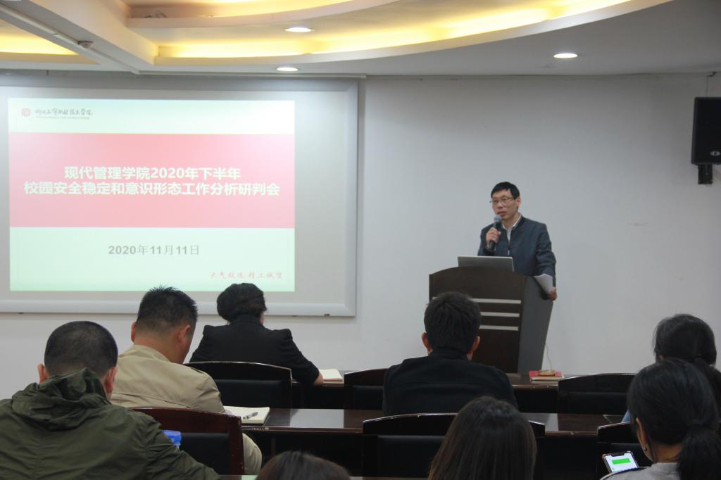 为了贯彻落实高校基层党组织校园安全稳定与意识形态工作责任制,2020年11月11日下午,现代管理学院在温州风险投资研究院会议室召开2020年下半年校园安全稳定与意识形态工作分析研判会,现代管理学院党政领导、办公室主任、实训中心主任、全体辅导员和班主任参加会议,会议由现代管理学院党总支书记项光春主持。