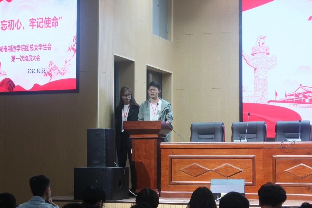 光电制造学院团总支学生会第一次动员大会于10月28日下午五点半在行政楼105召开。出席本次会议的有光电制造学院党总支书记张勰老师,18级主席团杨国学长、李汉学长和陶晨超学长,19级主席团应俐聪、黄振寅、陈伟妙、各中心主任以及全体学生会干事。本次会议由学生会主席黄振寅主持。