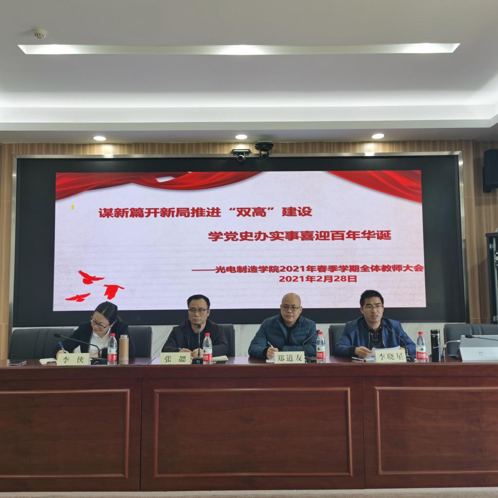 2月28日下午,光电制造学院在瓯江口校区104会议室举行2021年春季学期全体教师大会。此次大会的主题是“谋新篇开新局推进“双高”建设,学党史办实事喜迎百年华诞”,大会由分院副书记李侠主持,全体教师参加会议。