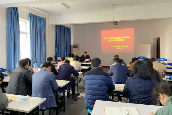 王本轶书记指出,我们要从以下几个方面深入贯彻习近平总书记在党史动员学习教育动员大会上的讲话精神:一是切实把思想和行动统一到习近平总书记的重要讲话精神上来,增强“四个意识”,坚定“四个自信”,坚决做到“两个维护”,带领全院师生学党史、悟思想、办实事、开新局。二是进一步感悟思想伟力,增强用党的创新理论武装全党的政治自觉,二级分院要进一步加强思想建设和政治建设,深刻学习领会新时代党的创新理论,坚持不懈用习近平新时代中国特色社会主义思想武装头脑、指导实践、推动工作。三是进一步把握历史发展规律和大势。学院的党建工作抓住历史变革时机,顺势而为,奋发有为,我们就能够更好前进。四是进一步深化对党的性质宗旨的认识,始终保持马克思主义政党的鲜明本色。五是进一步总结党的历史经验,发扬革命精神。进入新时代,学校的管理、建设工作既充满新的机遇,又面临新的挑战,我们要立足实际,不断提高应对风险挑战的水平,始终保持艰苦奋斗的精神。六是增强党的团结和集中统一,确保全党步调一致向前进。二级学院党建工作应当自觉在思想上、政治上行动上同以习近平同志为核心的党中央保持高度一致。
