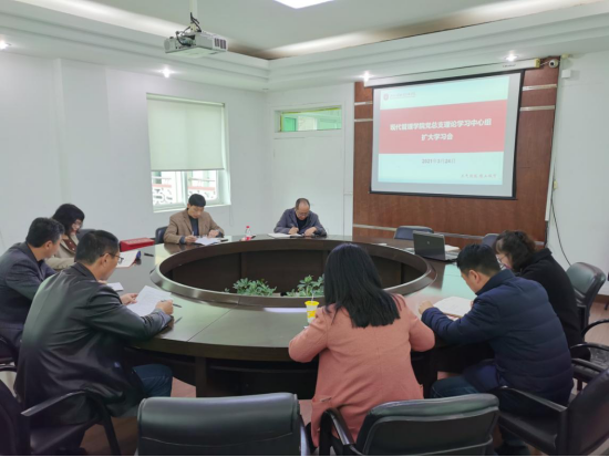 3月24日上午,现代管理学院党总支在府东路校区行政楼二号会议室举行理论学习中心组扩大学习会,学习习近平总书记在党史学习教育动员大会上重要讲话精神和全国两会精神。现代管理学院党政领导班子成员、办公室主任、实训中心主任参加学习会,学习会由现代管理学院党总支书记项光春老师主持。