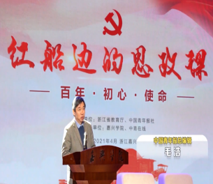 接着,嘉兴南湖上的新老两代人南湖革命纪念馆副馆长蒋臻、中共一大代表王尽美的长孙浙江大学教授王明华与嘉兴学院学生探讨了现代学生们学习党史的目标与愿望以及从党史中汲取力量需要我们牢记中国共产党的初心和使命:全心全意为人民服务、实现中国共产党的伟大复兴。最后,嘉兴学院学生以情景《初心·南湖会议》再现中共一大代表当年在南湖红船上开会的情景,带我们了解开天辟地的伟大时刻。